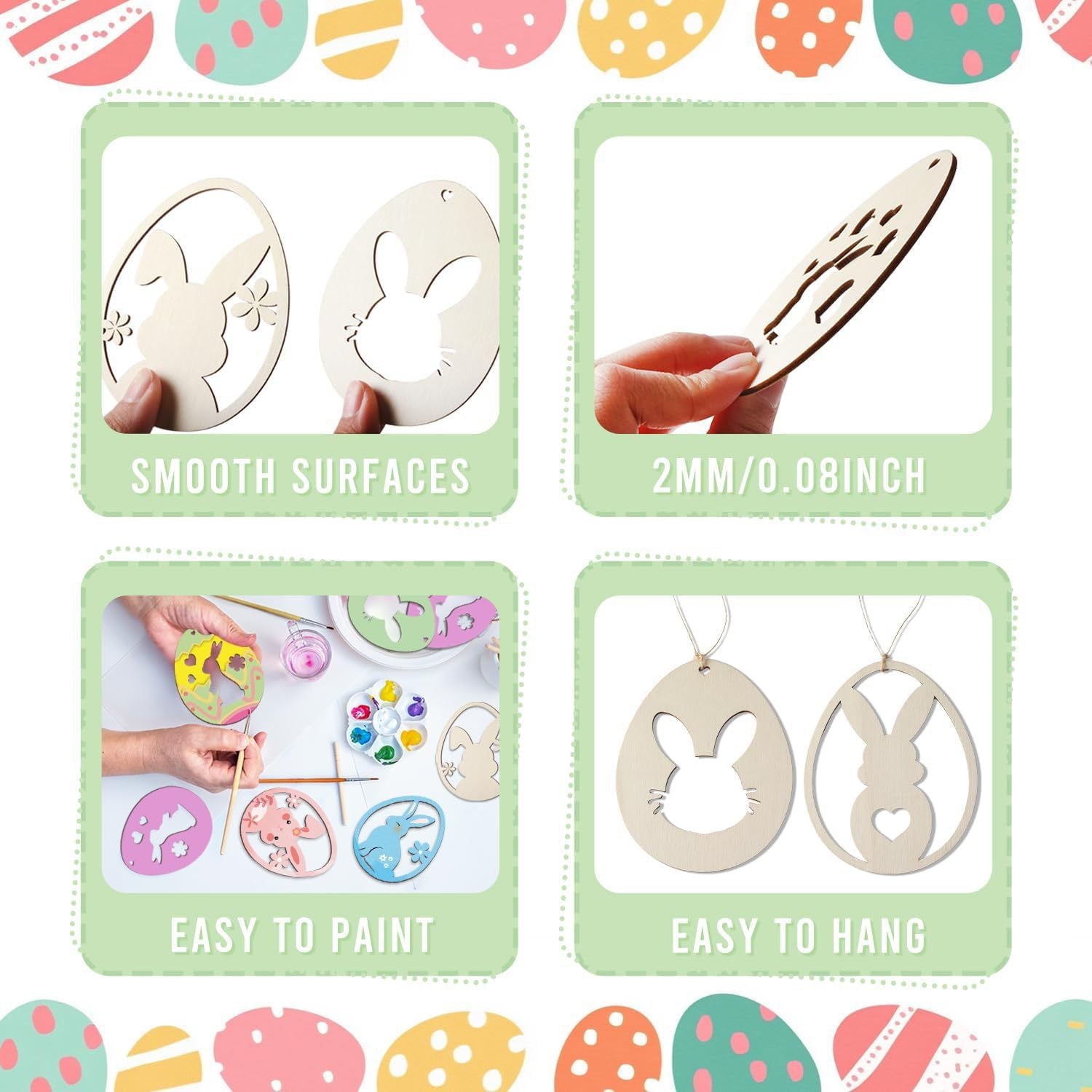 Dank des leichten Materials lassen sich die Holz-Ostereier problemlos aufhängen oder in Bastelprojekte integrieren. Ob zu Hause, im Kindergarten oder bei gemeinsamen Familienaktivitäten – diese Osteranhänger verbinden kreatives Spielen mit liebevoller Ostertradition und machen das Osterfest für Kinder besonders persönlich.